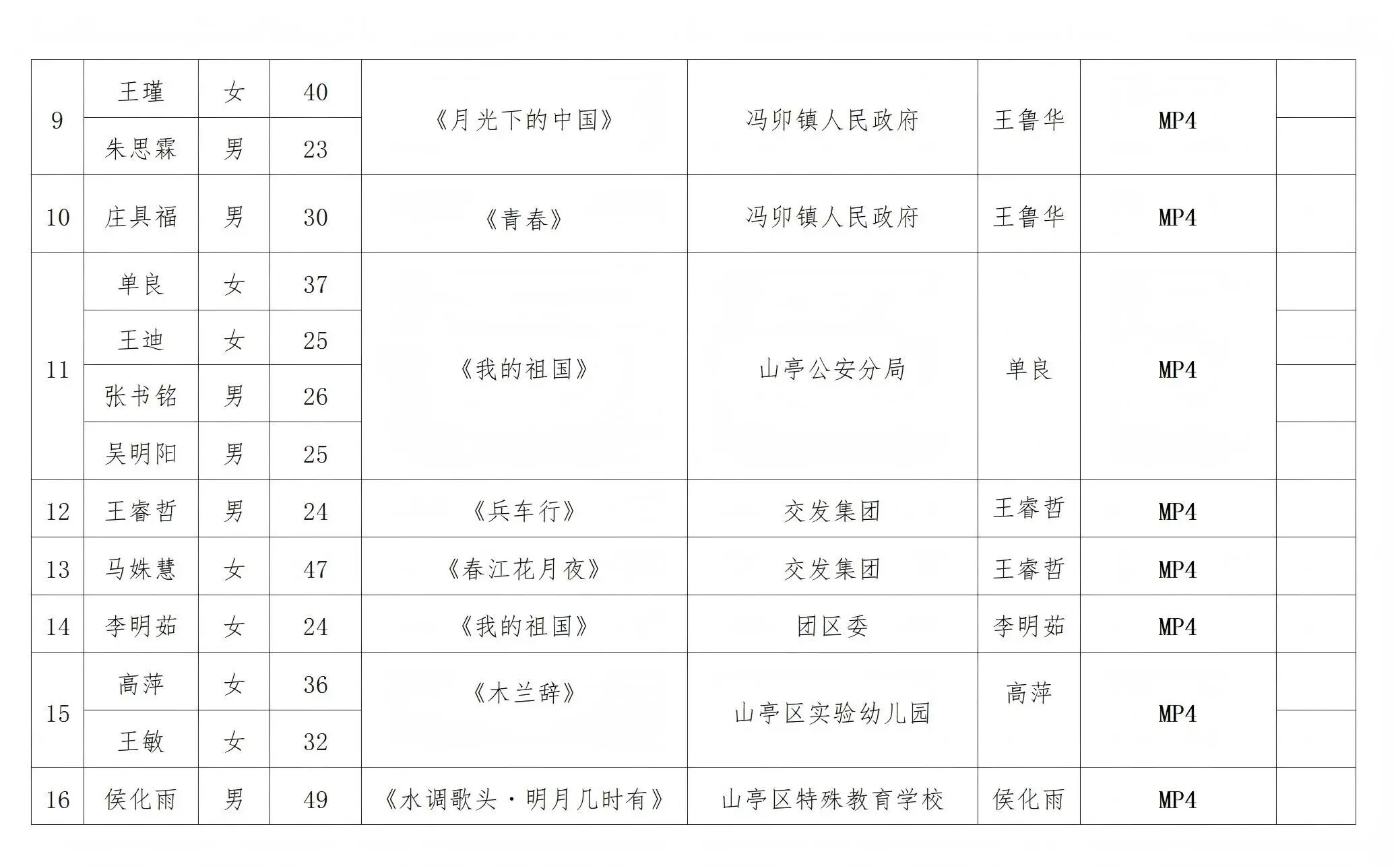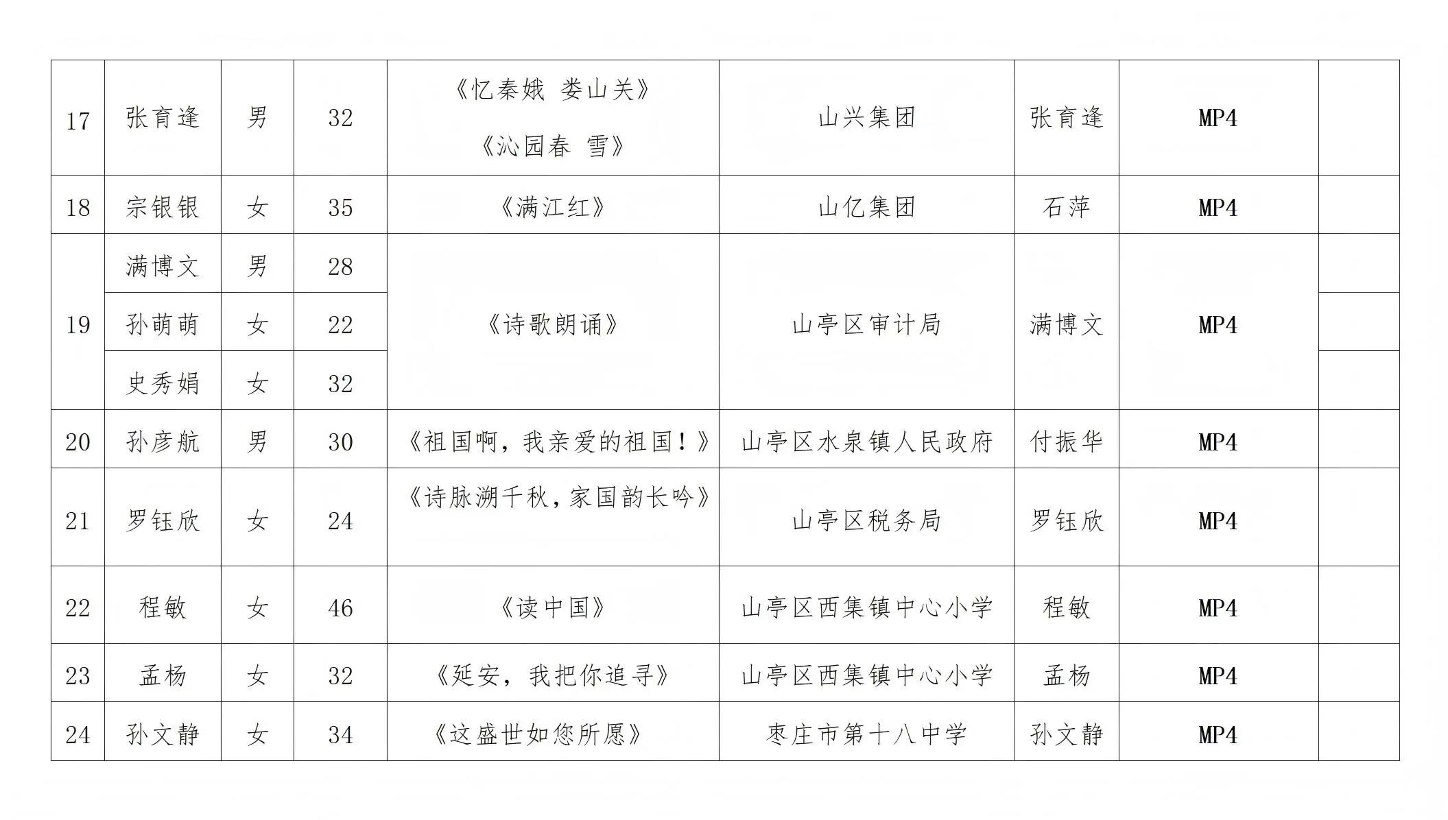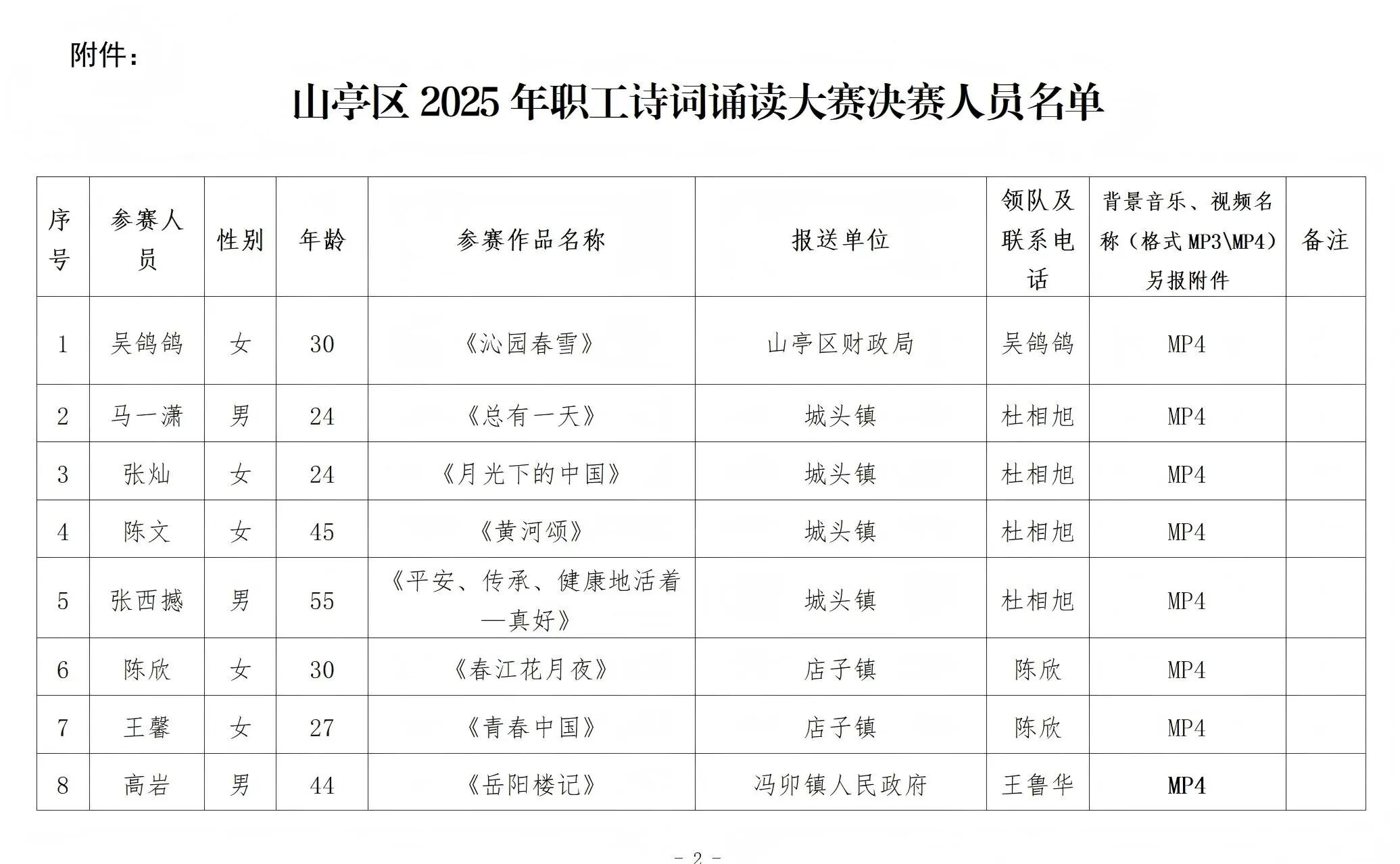 1.请各镇(街)、有关单位组织好本单位参赛选手按时参加,于9月28日下午1:30前到图书馆一楼国学讲堂报到。 2.请参赛选手将参赛背景视频、伴奏音乐于9月26日中午12点前发到图书馆邮箱stqtsg@126.com,联系人及电话:王婷 0632-8811329。 附:全区职工诗词诵读大赛参赛人员名单 山亭区文化和旅游局 2025年9月25日