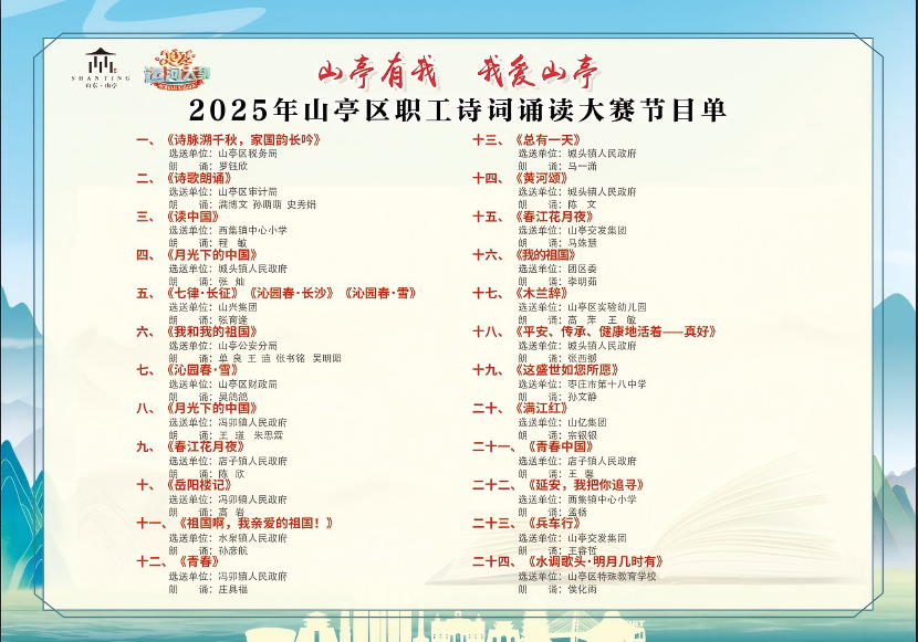 五千年文化,三千年诗韵,中华诗词如璀璨星辰,照亮了历史的天空。为进一步弘扬中华优秀诗词文化,赓续历史文脉,传承中华诗词经典,增进我区广大职工对中华优秀传统文化的认同和感悟,厚植“山亭有我、我爱山亭”情怀,助力“书香山亭”建设,形成爱读书、读好书、善读书的浓厚氛围。9月28日下午2点30分区图书馆一楼国学讲堂,我们以诗为约、以词为伴,共同走进2025年山亭区职工诗词诵读大赛的诗意殿堂!