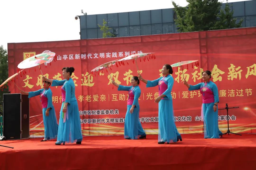 05开展“文明节俭迎‘双节’ 弘扬社会新风气”新时代文明实践活动。9月24日,在山亭区太清湖文化广场举办大型活动专场,邀请区直各单位志愿服务队成员、广大非遗传人、书画爱好者参加。活动现场,志愿者宣读并发放了《文明节俭过“双节”弘扬社会新风气倡议书》,展演了“山东琴书”“山东小鼓”“柳琴戏”等非遗节目,教育引导广大市民传承传统文化,弘扬志愿精神,培育文明风尚,增强节约粮食意识,共树文明节俭新风气。