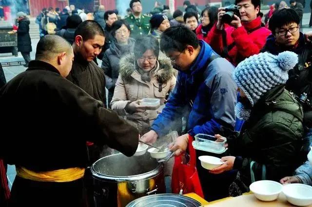 如今,北京人喝腊八粥之俗依旧,雍和宫、广化寺以及一些老字号商铺等仍会沿袭古时舍佛粥之俗。每年的腊八,雍和宫还会在宫内举办佛事活动,全体喇嘛诵读佛经,再将煮好的第一罐粥供于佛像前,然后开始惠民“舍佛粥”。只不过如今的“舍粥”已没有了救济穷人之意,而是提示人们不要忘本。在杭州各大寺庙,每年到了腊八节这一天,包括灵隐寺、永福寺、净慈寺等寺院,也都会免费施粥。