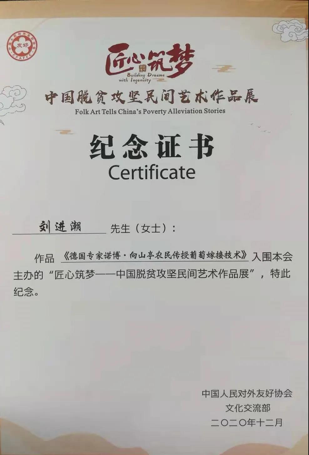 近日,由中国人民对外友好协会主办的“匠心筑梦—中国脱贫攻坚民间艺术作品展”在“云上”开幕,我区非遗传承人刘进潮创作的《德国专家诺博·向山亭农民传授葡萄嫁接技术》成功入选,并深受国内外网民称赞。
