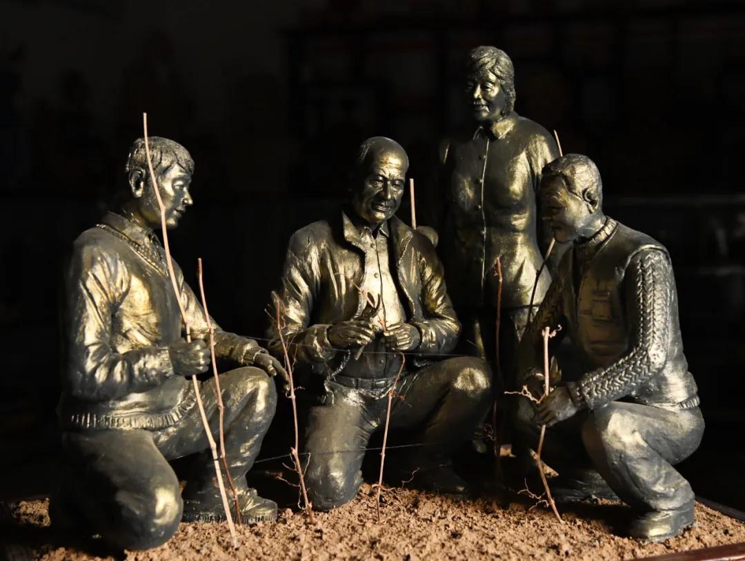 山亭区民间“守艺人”——刘进潮的作品《德国专家诺博·向山亭农民传授葡萄嫁接技术》采用泥塑艺术表现形式,来源于德国友人诺博、汉斯帮扶山亭的动人故事。2000年春天,花甲之年的诺博受中国外国专家局邀请,来到山亭,向农民们传授酿酒葡萄、车厘子等果树培育技术。2000年到2009年间,诺博与助理汉斯先后17次到枣庄山亭,送来优质苗木、传授种植技术、帮助当地人建立了葡萄庄园、葡萄酒厂,为山亭带来了清新的葡萄酒香、致富的崭新道路,与山亭人民结下不解之缘。2014年3月28日在德国进行国事访问的国家主席习近平专门讲诉了这段中德友谊故事。刘进潮的作品就歌颂了不断延续并历久弥香的中德情谊。作品材质采用本地天然陶土为原料,运用传统泥塑技法雕塑成型,通过高温1000度烧制而成,该作品曾荣获山东省泰山文艺奖。