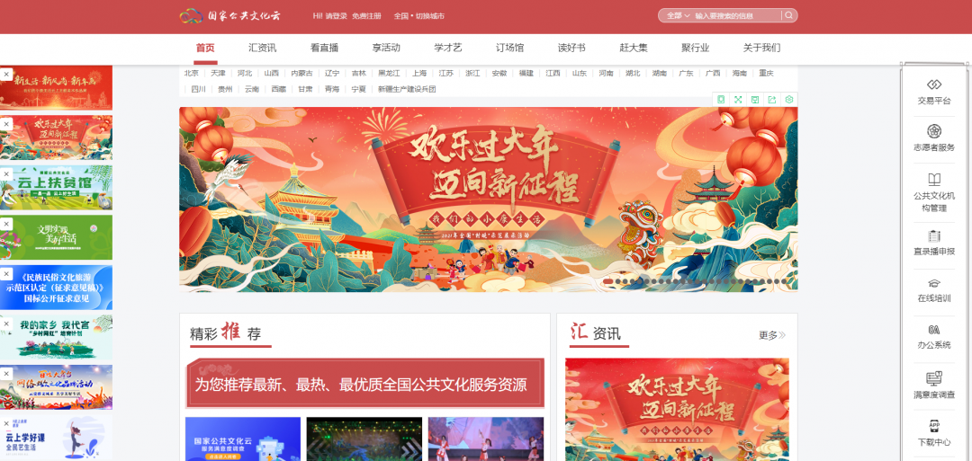 国家公共文化云平台由全国公共文化发展中心组织建设,以移动互联网为主要渠道,坚持用户导向,突出全民艺术普及服务功能,构建以看直播、享活动、学才艺、订场馆、读好书、赶大集六大功能为核心的全民艺术普及云服务体系,打造群众文化活动的大集成、大展台。