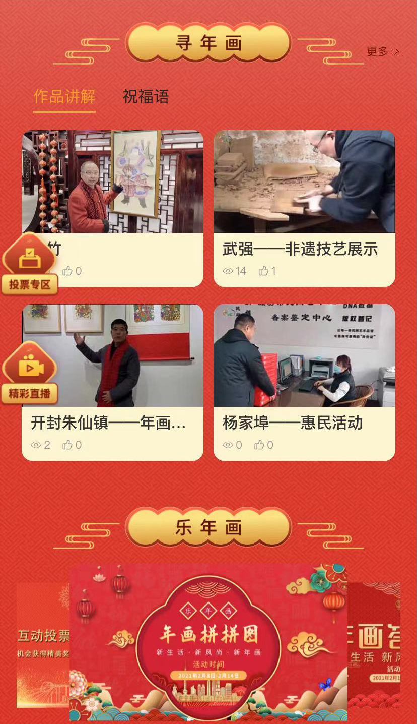 赏年画,在线展示各地推荐的优秀作品,对参加线下展览的作品做多维度重点推介;讲年画,由民间艺术评论家、作品创作者讲述创作故事,以采访视频、图文等形式,丰富画作的展示维度;绘年画,推出年画知识、艺术创意和绘画技能视频课程,在群众中开展年画艺术普及;寻年画,以中国传统年画创作流派、中国民间文化艺术之乡为分类导航,展示以年画为载体的优秀传统文化保护与传承;乐年画,围绕年画传统技艺、文学知识、传统节庆等内容,开展系列线上互动答题活动。