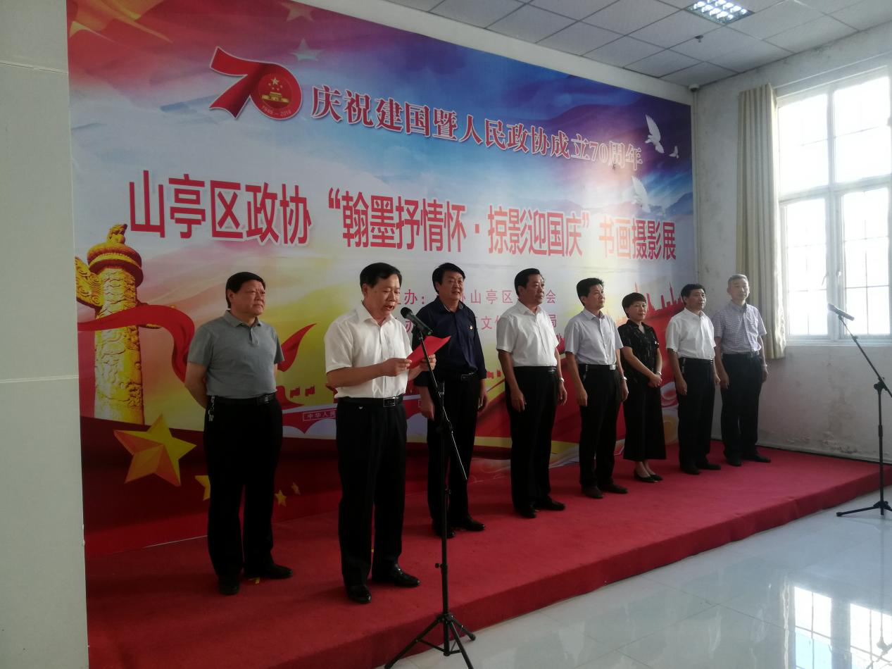 为庆祝建国和人民政协成立70周年华诞。9月23日,由政协枣庄市山亭区委员会主办,山亭区文化和旅游局协办的“翰墨抒情怀•掠影迎国庆——山亭区政协庆祝建国暨人民政协成立70周年书画摄影展”隆重开幕。区政协主席柴正民,区委常委、办公室主任赵传筠,区人大副主任刘建法,区政府副区长廖华,区政协副主席孙友华、彭智杰、牛逸群等领导同志出席开幕式。来自区政协机关,区文旅局机关,区直委员活动组、山亭经济开发区委员活动组成员,各镇(街)政协委员联络室负责人和政协委员,入展作者,以及城区群众200余人参加活动。