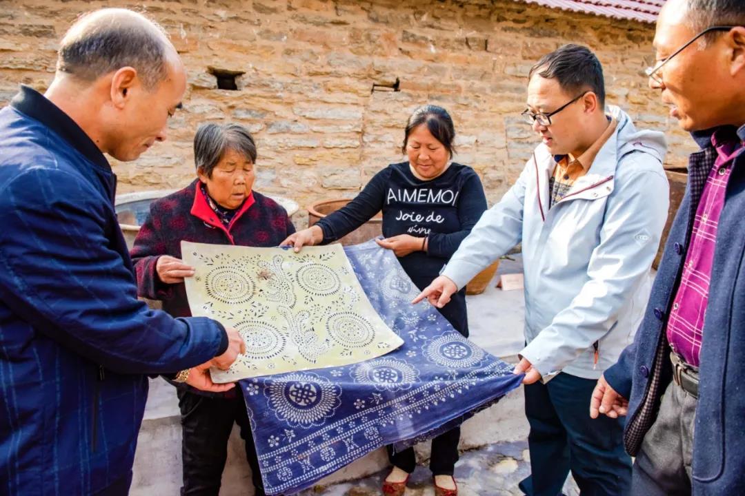 10月20日,在水泉镇西堌城村“乡村记忆馆”,李江(左)向参观者讲解牛耕农具(牛梭子)的使用方法、向参观者介绍马灯的照明历史、向参观者介绍蓝印花布的印染工艺。