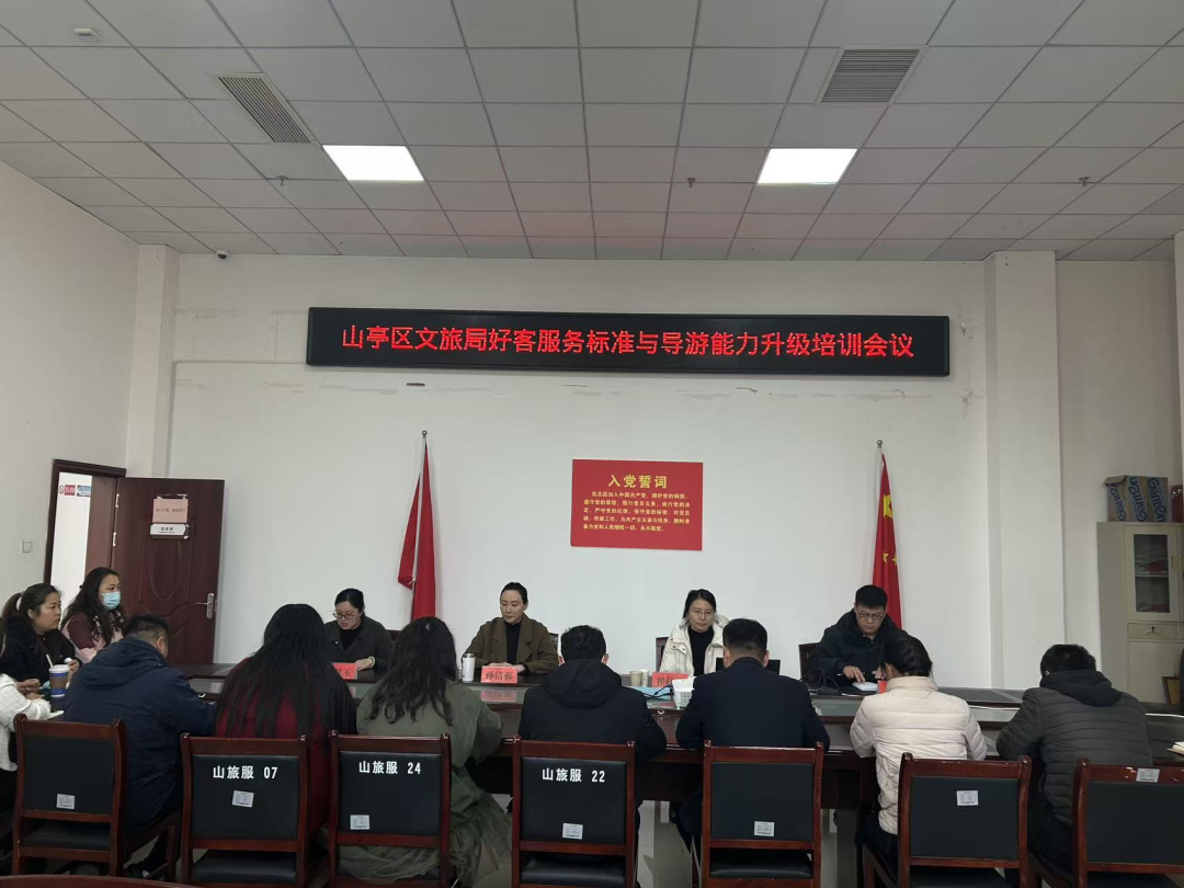 新闻动态区文旅局召开好客服务标准与导游能力升级培训会议录入时间:2025/12/11 Hits:6 2025年11月26日,枣庄学院旅游与资源环境学院旅游管理专业副教授孙倩蓉、旅游管理专业讲师翟晓燕前往山亭区文旅局二楼会议室,开展以“好客服务标准与导游能力升级”为主题的专题培训。A级景区、酒店、旅行社等相关负责人参加培训。山亭区文化和旅游局副局长、区文化市场综合行政执法大队大队长王君玉,区文化市场综合行政执法大队副队长梁志亭共同出席并主持了本次培训会议。