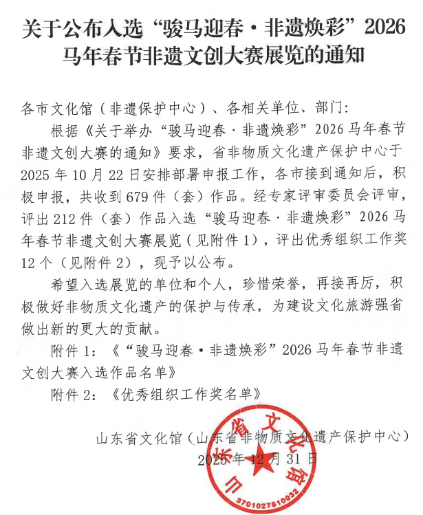 新闻动态喜讯!山亭区多个作品入选2026马年春节非遗文创大赛展览录入时间:2026/1/5 Hits:33 骐骥驰骋开盛景,非遗焕彩贺新春!近日,由山东省文化馆主办的“骏马迎春·非遗焕彩”2026马年春节非遗文创大赛展览名单正式揭晓,山亭区三位作者凭借精湛技艺与创意巧思,其作品成功入选,为家乡非遗文化赢得了荣誉!