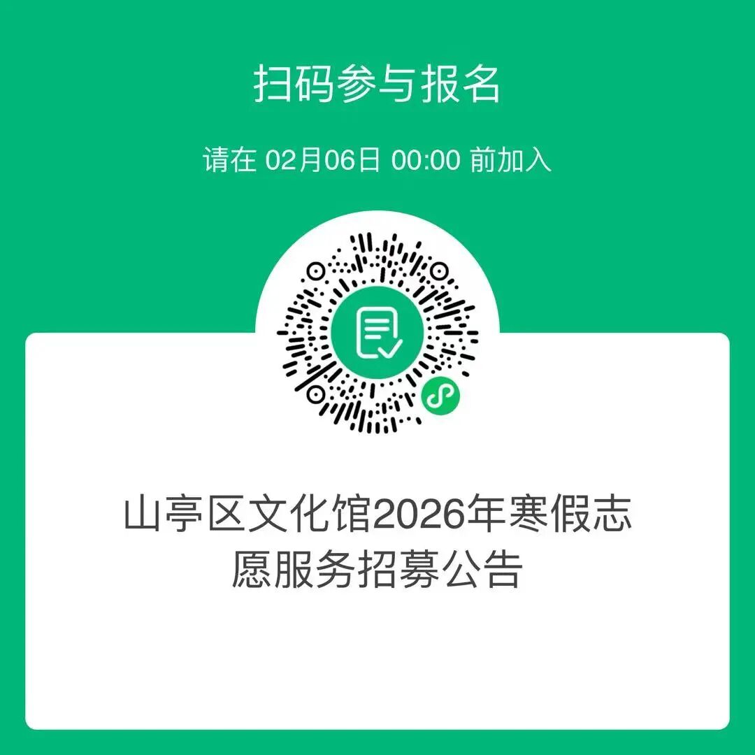 为传承弘扬中华优秀传统文化,丰富寒假期间群众文化生活,营造温馨互助、开放多元的城市艺术氛围,切实推动公共文化服务提质增效,山亭区文化馆现面向社会公开招募2026年寒假志愿服务者,诚邀各界热心文化事业的市民加入,以志愿之力传递文化温度,共筑美好文化家园。 一、招募对象 自愿投身群众文化志愿服务,热爱中华优秀传统文化、热心公益事业的文化爱好者; 具备一定文化艺术特长和辅导能力的大专院校在校学生、社会各界人士; 年龄在18周岁至60周岁,身体健康,符合上述条件的群众均可申请报名。 二、报名条件 能力要求:有一定的文艺特长(如书画、音乐、舞蹈等)、艺术创作经验者优先;具备良好的沟通协调能力,善于团队协作,能服从文化馆统一指挥、统一调度,有序参与志愿服务; 身体要求:体貌端正、身心健康,具备胜任对应岗位工作的身体条件,无传染性疾病; 品行要求:具有中华人民共和国国籍,拥护党的路线方针政策,遵纪守法、热爱文化艺术事业,具有强烈的奉献精神和服务意识,责任心强、作风踏实。 三、服务内容 公共文化服务宣传与推广,协助普及文化知识、传播非遗文化,提升群众文化参与积极性; 公益性文化讲座、艺术培训与辅导,协助开展各类公益文化活动,为群众提供基础艺术指导; 公益性展览(含非遗展厅)的布展、参观引导、志愿讲解,维护展厅秩序与展品安全,解答参观者咨询; 参与群众性文化活动的组织、演出协助等服务工作,保障活动顺利开展; 协助文化馆工作人员开展各类文化惠民活动,完成馆内安排的其他志愿服务任务。 四、服务时间与地点 服务期:2026年2月9日—3月3日(春节法定假期服务时间以馆内排班表为准); 场馆日常开放服务时段:每周一至周五上午8:30-12:00,下午1:00-5:00; 服务地点:山亭区文化馆(山亭区府前路6号—市民中心西北部)。 五、奖励机制 本次志愿服务为公益性服务,不发放工资及劳动报酬; 文化福利:志愿者可优先参与文化馆举办的非遗体验、专家讲座、艺术培训等各类文化活动; 荣誉激励:服务时间达到规定时长和次数的志愿者,可开具社会实践证明;对积极服务、表现突出的个人,报上级部门批准后授予相应荣誉证书,予以表彰鼓励。 六、报名方式 有意向参与志愿服务的群众,请携带本人身份证及相关特长证书(如有),前往山亭区文化馆一楼办公室现场报名,也可通过扫码方式报名。